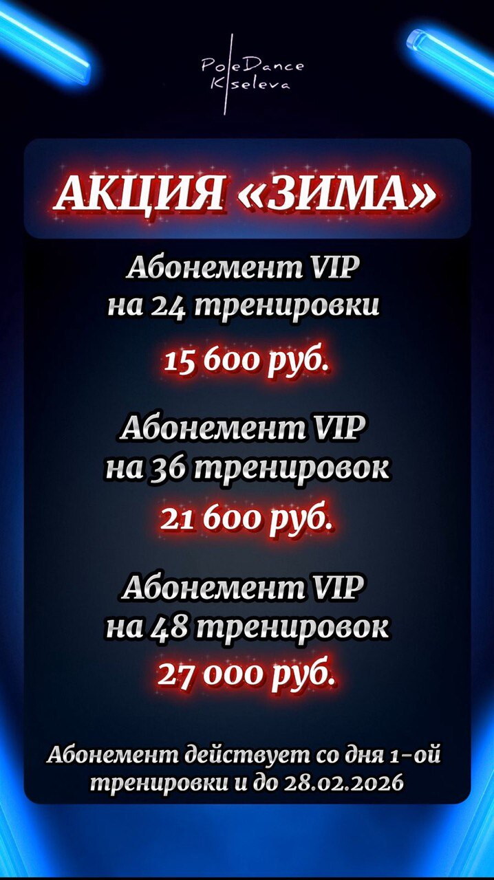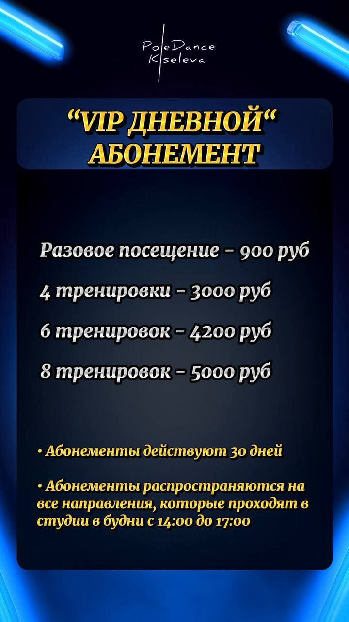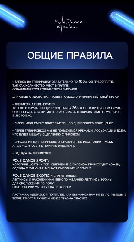 По поводу времени работы вы можете проконсультироваться у администраторов школы Pole Dance Kiseleva. И не забудьте обсудить с ними или вашим тренером основные нюансы разрешённой степени нагрузки. Мы хотим, чтобы вы были здоровыми и сильными!