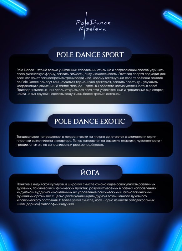 Ощущать себя великолепно можно только тогда, когда бодр и здоров. Школа Pole Dance Kiseleva неустанно развивается, чтобы пробуждать в вас силы и красоту.