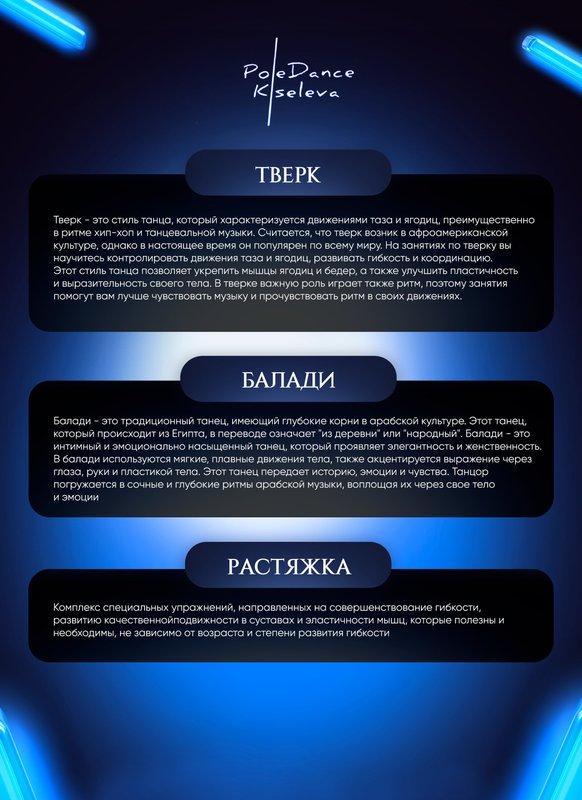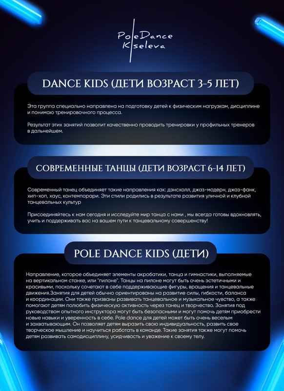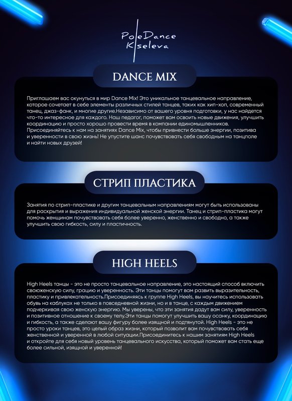Также здесь работают только профессиональные преподаватели-танцоры, и они найдут подход к любому ученику. А что как не танец развивает такие разные качества: и гибкость, и силу мышц, и особенно ощущение ритма! Наши ученики могут научиться танцевать сразу несколько направлений: dance mix, стрип-пластику, пол-дэнс и танец живота. Мы с удовольствием обучим техничности и, конечно, подаче.
